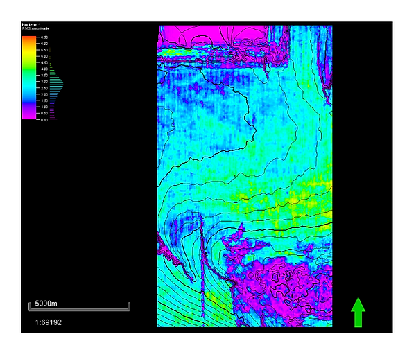Figure 11: shows the surface RMS amplitude of Horizon 5.This horizon has the least areas showing high RMS amplitude. The top of this horizon is taken from time slice of -2630 and the bottom part of this horizon is at time slice of -3530.